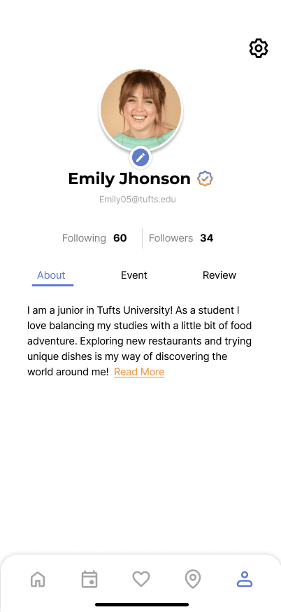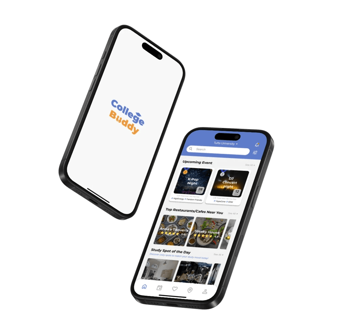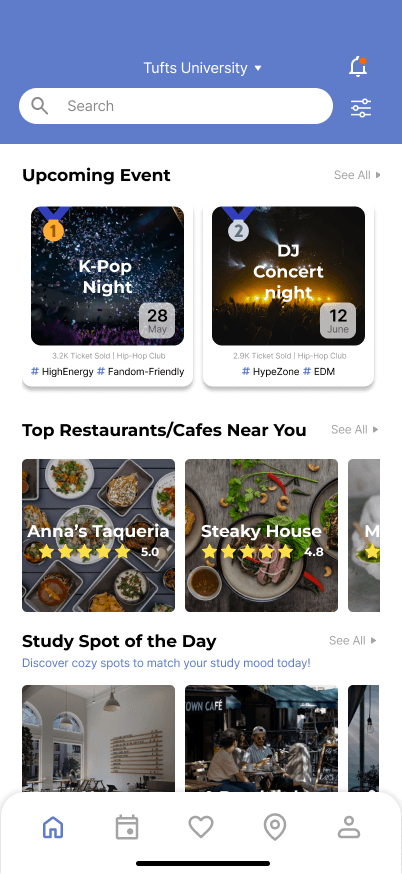 College Buddy is a campus engagement app created during Tufts Producthon 2025, a 36-hour design challenge. Our team designed a solution that helps students discover events, connect with peers, and feel more integrated into college life. The goal was to reduce the gap between available campus activities and how easily students can find and join them, resulting in a simple and personalized platform that makes campus life easier to navigate.